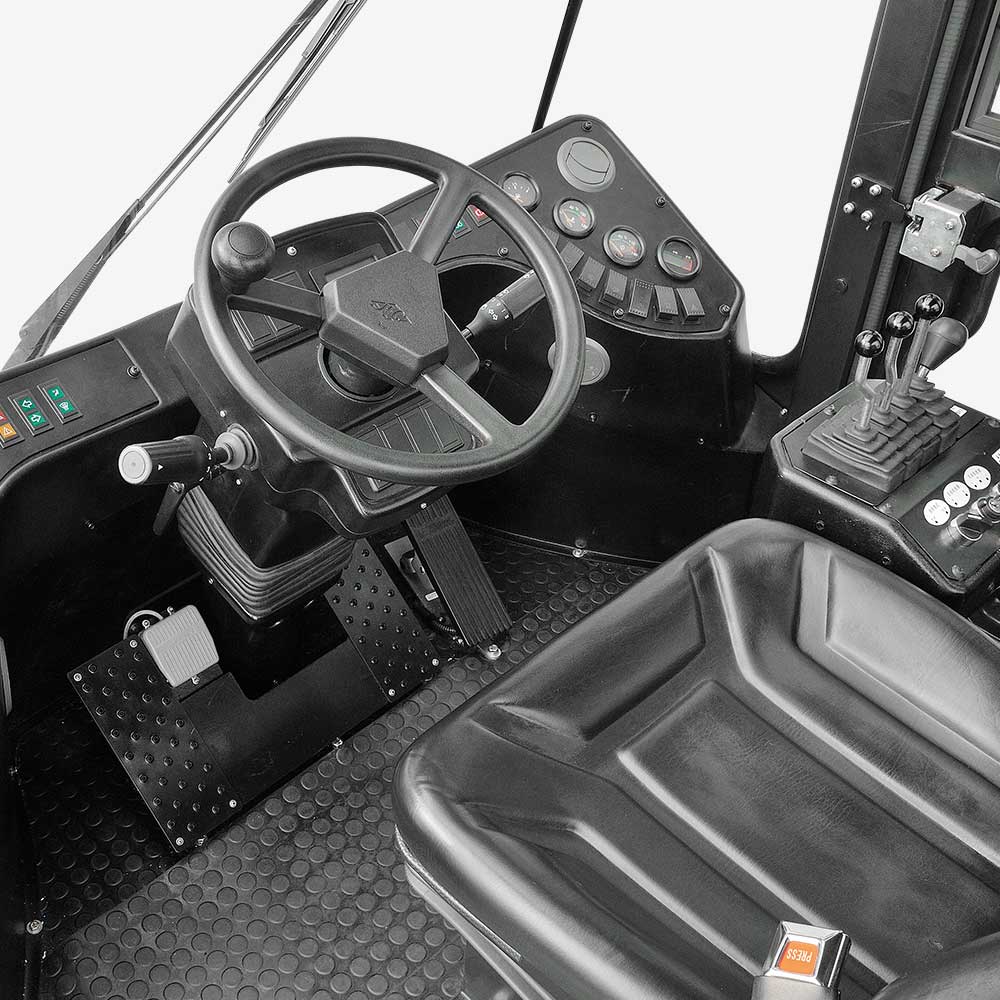 Integral full suspension tilting cabin, connected with the frame through damping rubber, which can shield most of vibration and noise. The tilted cabin which configured wide vision, suspension seat, electric control and hydraulic control joystick, is simple and easy for operation and maintenance. It provides alarge space for drivers legs.